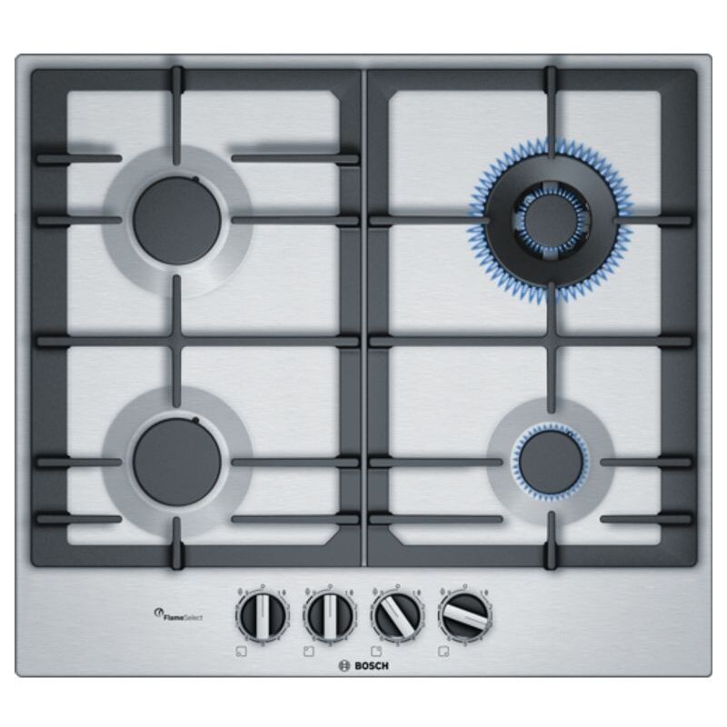 Il piano cottura a gas da incasso con FlameSelect: risultati perfetti grazie a 9 livelli di potenza. - FlameSelect: per una regolazione precisa della fiamma con 9 livelli di potenza predefiniti. - Bruciatore WOK: potenza fino a 3.5 kW. - Griglie d'appoggio in ghisa: per una massima stabilità e sicurezza. - Manopole a ponticello: per un controllo ergonomico. - Superficie elegante in acciaio inox Bosch Serie 6 PCH6A5B90. Colore del prodotto: Nero, Acciaio inossidabile, Posizionamento dell'apparecchio: Da incasso, Tipo di piano cottura: Gas. Tipo di controllo: Manopola, Posizione di controllo: Frontale superiore. Potenza aggregata (gas): 8000 W, Tensione di ingresso AC: 220-240 V, Frequenza di ingresso AC: 50 - 60 Hz. Larghezza: 582 mm, Profondità: 520 mm, Altezza: 45 mm Design Numero di fuochi 4 Fornello(i) Tipo di fornello/zona cottura 1 Regolare Forma del piano cottura 1 Rotondo Posizione del fornello/zona cottura 1 Posteriore sinistro Fonte di alimentazione del fornello/zona cottura