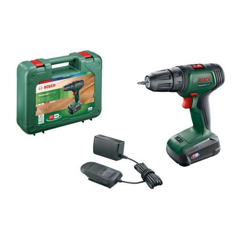 UniversalDrill 18: trapano avvitatore a batteria per forare legno, metallo, plastica e per avvitare. Impugnatura e mandrino automatico. Una batteria intercambiabile da 18V per i tuoi utensili cordless al litio. Fornito con: caricabatteria AL 1810 CV e 1 batteria 18V 1,5Ah, doppia punta a vite, valigetta