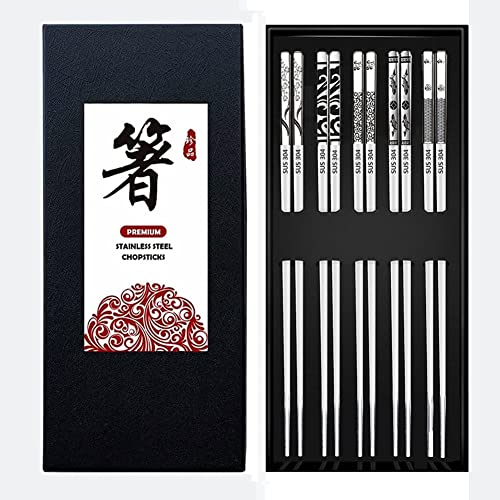 Bosdontek Bacchette in Metallo Riutilizzabili, 5 Paia di Bacchette in Acciaio Inox, Lavabili in Lavastoviglie con Motivo per Incisione, Bastoncini Giapponesi, Bacchette Sushi Set Regalo (Argento)