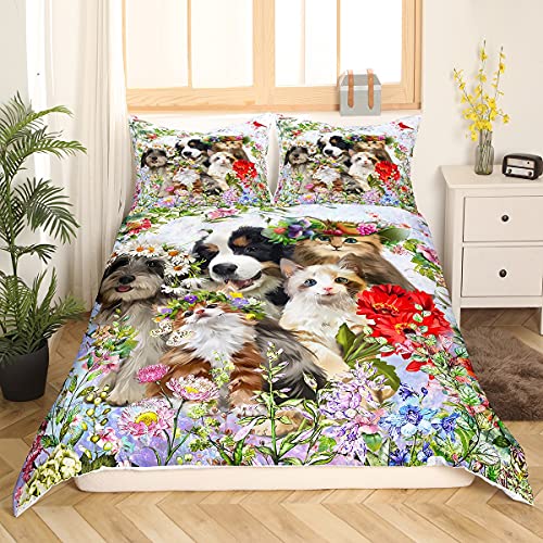 Botanica, set di biancheria da letto da 3 pezzi in morbida microfibra con copripiumino stampato con cane e gatto floreale e 2 federe, per letto matrimoniale