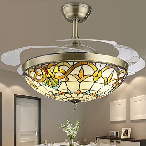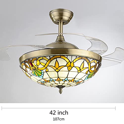 BOTOWI Ventilatori A Soffitto con Luci E Telecomando,Luce del Ventilatore A Soffitto Stile Tiffany con Lame Retrattibili Lampade A LED Dimmerabili Cambio A 3 Colori E 3 velocità,42 Pollici,220V,Clear