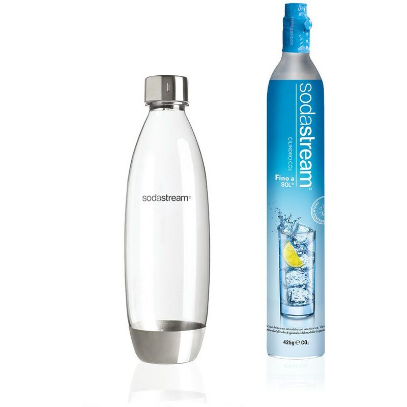 IL KIT CONTIENE 1 Bottiglia in plastica da 1 litro con base e tappo in metallo 1 Cilindri di Co2 alimentare per gasare fino a 80 Litri Compatibile SOLO con i gasatori modello SPIRIT, ONE TOUCH, SOURCE, POWER e PLAY. Non compatibile con i gasatori WASSERMAXX Design Accattivante Riutilizzabili CARATTERISTICHE Il tappo possiede una guarnizione isolante in gomma che permette alla bottiglia di conservare la bevanda gassata per molto tempo. La bottiglia è completamente riciclabile. Le bottiglie hanno una data di scadenza indicata sulla bottiglia stessa. AVVERTENZE Questo modello non è lavabile in lavastoviglie