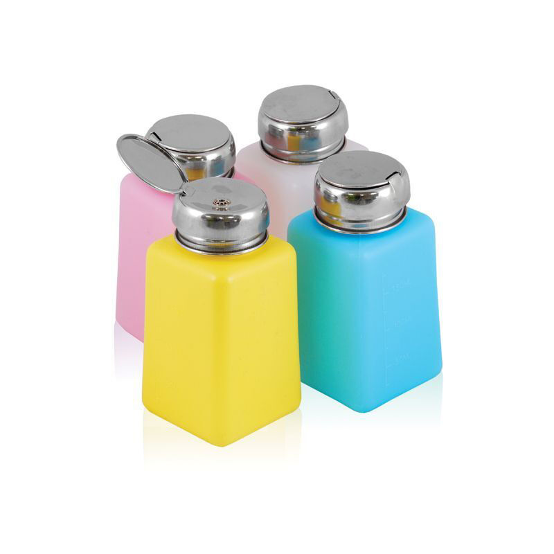 Bottiglia cromata 180 ml Bottiglia MIX COLOR con pompa in metallo e contenitore in plastica, 180 ml, per tutti i liquidi. Rende il lavoro molto più semplice grazie alla pratica applicazione dei liquidi su un dischetto o dischetto di cotone, indispensabile in ogni ufficio. Prodotto imballato in modo casuale.