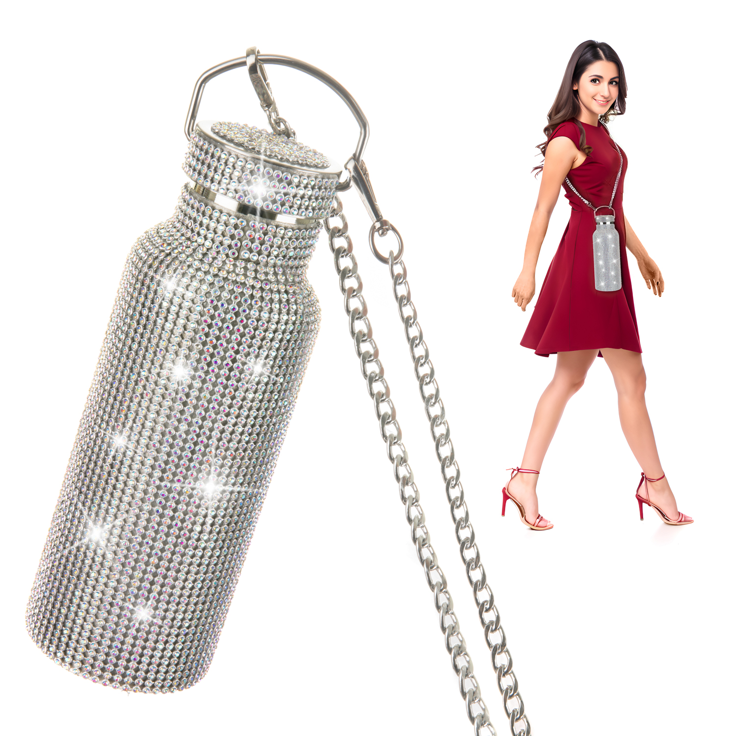 La bottiglia termica diventa un accessorio moda da portare in giro a tracolla per il massimo della praticità! Decorata con strass gioiello, questa bottiglia è anche molto funzionale. È realizzata in acciaio inox 18/8, provvista di tappo isolante e riesce a tenere la temperatura di bevande calde o fredde per ben 12h. Indispensabile quando sei in giro e hai bisono di dissetarti con stile. Capacità: 500 ml.