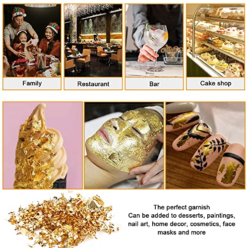 [Cosa Ottieni] Questa confezione contiene 2 bottiglie di fiocchi di foglia d'oro. Il contenuto netto è di 5.4g. La dimensione della bottiglia è 3,93 x 2,16 pollici, sufficiente per le tue esigenze fai-da-te.