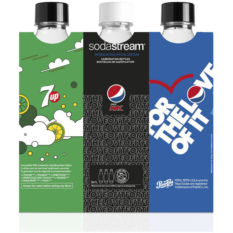 Bottiglie Tripack Fuse Pepsi 1 litro . Dal design accattivante. Perfette per bere la tua acqua frizzante o bibita frizzante fatta con gasatore Sodastream. Il tappo possiede una guarnizione isolante in gomma che permette alla bottiglia di conservare la bevanda gassata per molto tempo. La bottiglia è completamente riciclabile. Le bottiglie hanno una data di scadenza indicata sulla bottiglia stessa. Compatibili con Spirit, One touch, Power, Play e Source.