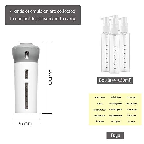 Contenuto del pacchetto: bottiglia da viaggio da 1" con bottiglie interne da 4 x 50 ml, ad esempio per shampoo, gel doccia, latte solare, panna, articoli da toeletta e cosmetici, etichette adesive da 1" per l'etichettatura individuale delle bottiglie