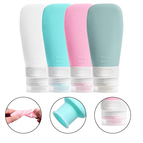 Bottiglie da Viaggio in Silicone 4 Pezzi 60ml Contenitori da Viaggio Riutilizzabilia Prova di Perdite con Sacchetto Trasparente da Toeletta, Senza BPA, per Shampoo, Balsamo, Lozione
