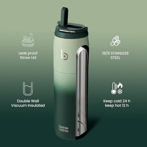 BOTTLE BOTTLE Borraccia in acciaio inox con cannuccia e coperchio, borraccia termica sottovuoto, mantiene il freddo per 24 ore, calda per 12 ore, borraccia sportiva a prova di perdite, verde