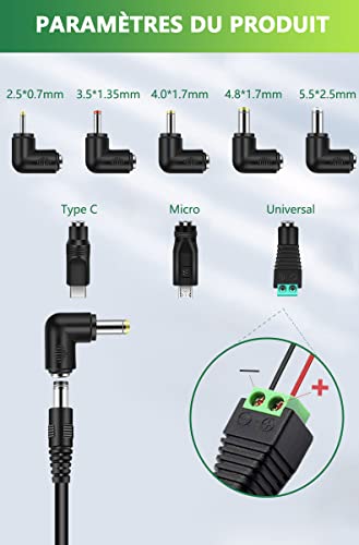 【Più selettivo】Per soddisfare le vostre esigenze, vi offriremo 8 connettori, connettore regalo: Micro-USB / Type-C / 2,5 x 07 mm / 3,5 x 1,35 mm / 4,0 x 1,7 mm / 4,8 x 1,7 mm / 5,5 x 2,5 mm, può alimentare la maggior parte dei vostri numerosi dispositivi 5 V DC, commutare facilmente punte DC a mano, offrendo più scelta di ricarica