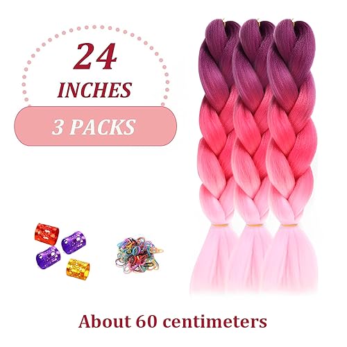 BouGPeng Treccine Extension per Treccine Africane 3Pezzi 24inch Ombre Jumbo Treccia Capelli Fibra treccia 100 g/pacco Kanekalon Treccia Capelli per Crochet Twist Intrecciare(Viola & Rosso & Rosa)