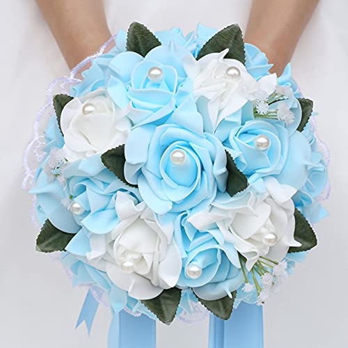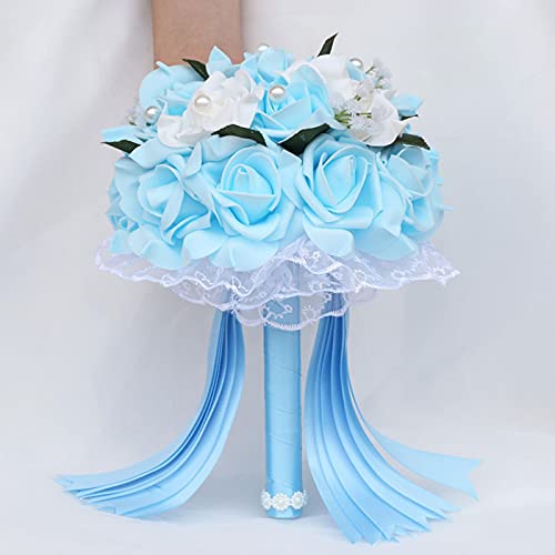 Bouquet da sposa azzurro e damigella d'onore con bouquet di spille di diamanti rosa in raso Decorazione fai da te per la chiesa di nozze