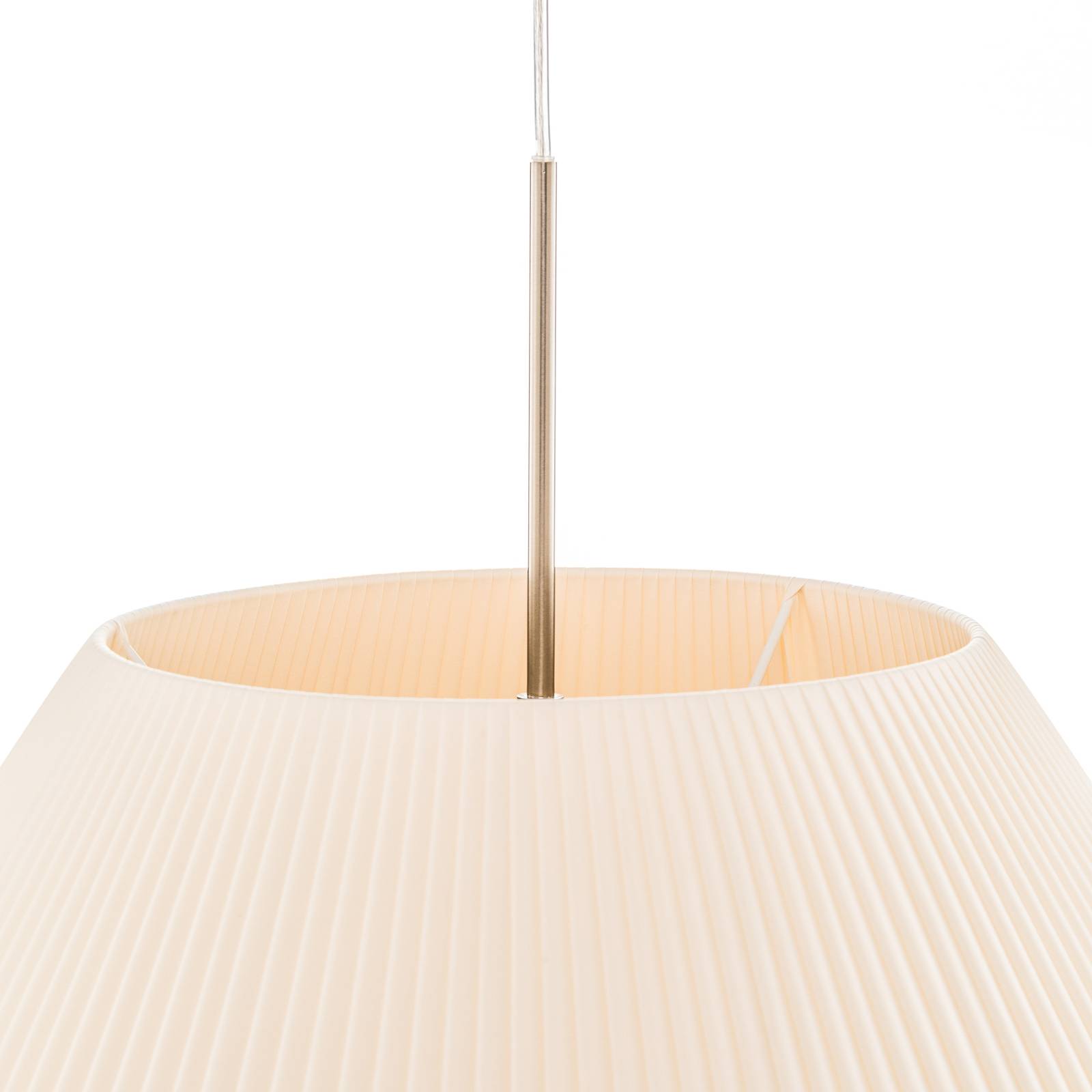 Lampada a sospensione senza tempo Mei di Joana Bover Un'ampia apertura della luce e una speciale superficie d'ombra distinguono il modello Mei di Bover. La grande apertura luminosa permette un'ampia distribuzione della luce, che viene inoltre distribuita uniformemente dal disco diffusore in PVC. Inoltre, il diffusore assicura che non si verifichi alcun abbagliamento. Il fatto che la luce creata da Mei abbia un effetto particolarmente accogliente è dovuto alla superficie dell'ombra. Un nastro di tessuto nobile color crema è stato avvolto intorno a un telaio di filo metallico durante la produzione del paralume, risultando in un paralume tessile che si distingue dai paralumi ordinari di questo tipo grazie alla sua tecnica di fabbricazione. Nell'azienda Bover di Barcellona, molte fasi del processo di fabbricazione sono ancora eseguite a mano, per esempio la produzione del paralume Mei. Sia il telaio di supporto che il paralume a nastro in tessuto sono lavorati a mano. Questo garantisce una certa qualità. Joana Bover è la fondatrice dell'azienda e la designer di Mei. Fin dall'inizio, una delle massime più importanti per il suo lavoro è stata la creazione di qualcosa senza tempo che possa durare negli anni grazie alla sua alta qualità e che piaccia ancora guardare dopo molto tempo.