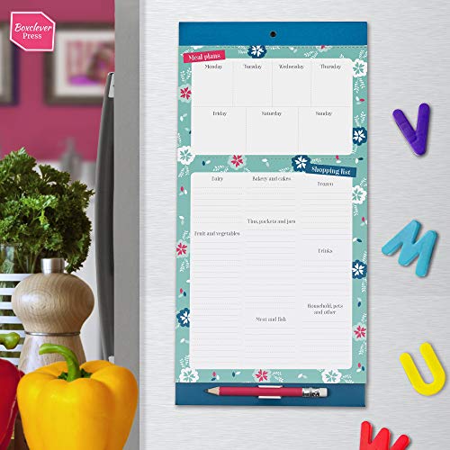 Boxclever Press Lista della spesa magnetica, piano menu da frigo. Blocco magnetico con lista spesa e menu settimanale con matita con clip e tasca per scontrini e buoni (Blu)