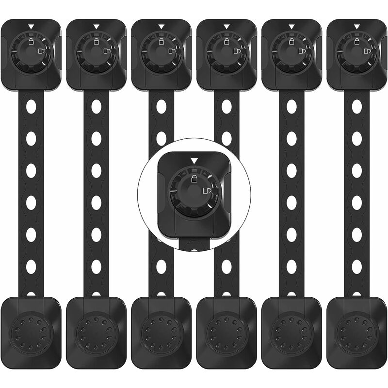 Prova per bambini piccoli e amici pelosi: Le serrature delle porte a prova di bambino impediscono al tuo piccolo esploratore o ai tuoi adorabili animali domestici di entrare in un luogo pericoloso o di rovinare la casa. Si adatta a armadi, credenze, cassetti, sedili del water, finestre, forni, ecc. Sistema di doppia chiusura migliorato: I modelli di serratura per armadio per bambini hanno un doppio sistema di chiusura che impedisce a bambini o animali domestici di aprire ante o cassetti e li tiene al sicuro. Le serrature di sicurezza per armadietti per bambini offrono ai tuoi bambini un'infanzia sicura. Materiale durevole e non tossico: I nostri lucchetti di sicurezza per bambini sono realizzati in ABS e TPE atossici, che offrono maggiore flessibilità e durata, offrendo al tuo bambino una casa sicura senza sostanze chimiche. Cinturino regolabile per vestibilità personalizzata: Progettate con fori per cintura e una manopola di blocco regolabile intelligente, le serrature di sicurezza