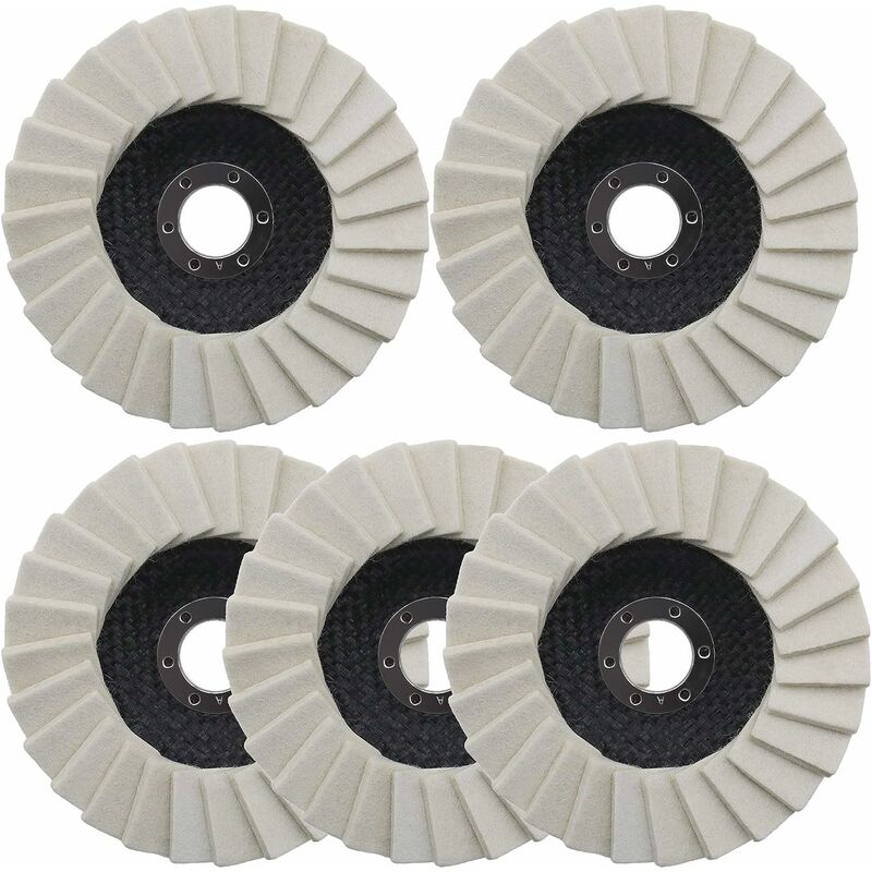 la ruota è di 125 mm / 5 pollici. [Ampio utilizzo]: adatto per la lucidatura di smerigliatrici angolari in acciaio inossidabile, metalli, alluminio, vetro, acciaio, ecc. [Max RPM]: necessario meno di 15300 rmp. [Nota]: confermare la taglia prima dell'acquisto. Applicazione: metallo, acciaio inossidabile, acciaio, vetro, alluminio Articolo Specifiche: Materiale: lana, plastica Diametro esterno: 125 mm / 5 pollici Diametro foro: 22 mm / 0,9 pollici Massimo RPM: 15300 Confezione: 5 pezzi 5 pollici/125 mm di lana per smerigliatrice angolare con dischi per lucidatura con lamelle in feltro (Nota: altri accessori non sono inclusi.) diventa molto ricco
