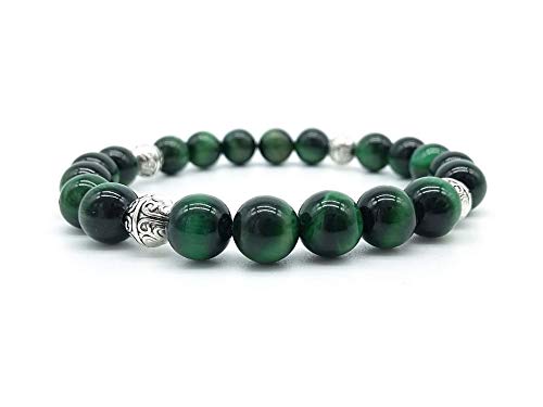 Bracciale Azteco Unisex in Occhio di Tigre Verde, con Sfere in Metallo, Pietre Dure, Elastico 19cm, Fatto a Mano