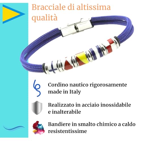 questo meraviglioso bracciale è realizzato con bandiere cilindrice in acciaio smaltato e cordino nautico rigorosamente made in italy