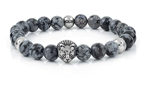 10:10 Bracciale elastico con pietre naturali da 8 mm, testa di leone centrale e sfere diamantate in acciaio inox. Made In Italy