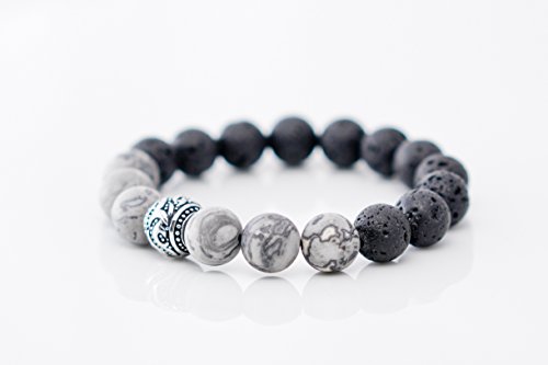 Pietre preziose: braccialetto da uomo con pietre laviche nere da 10 mm e pietre diaspro grigie opache, fornito in un sacchetto di lino.