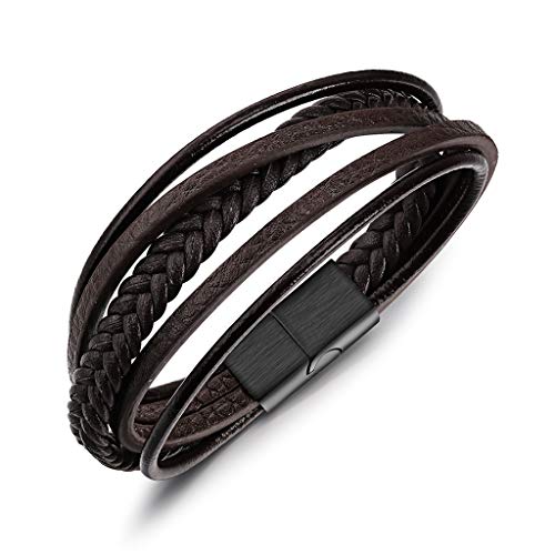 Bracciale da Uomo in Vera Pelle Intrecciato Multistrato Braccialetto Cuoio Nero e Marrone Chiusura Magnetica in Acciaio Inossidabile 21cm(8.26") (Marrone)