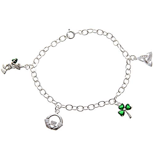 Braccialetto in argento sterling con ciondoli irlandesi (leprecano, trifoglio, claddagh e simbolo della trinità)