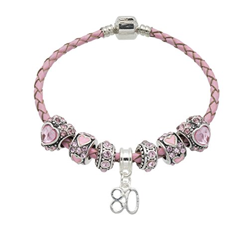 Braccialetto da donna in pelle rosa con ciondolo per compleanno, con confezione regalo, disponibile per età 18°, 20°, 21°, 25°, 30°, 35°, 40°, 45°, 50°, 55°, 60°, 70° e 80°