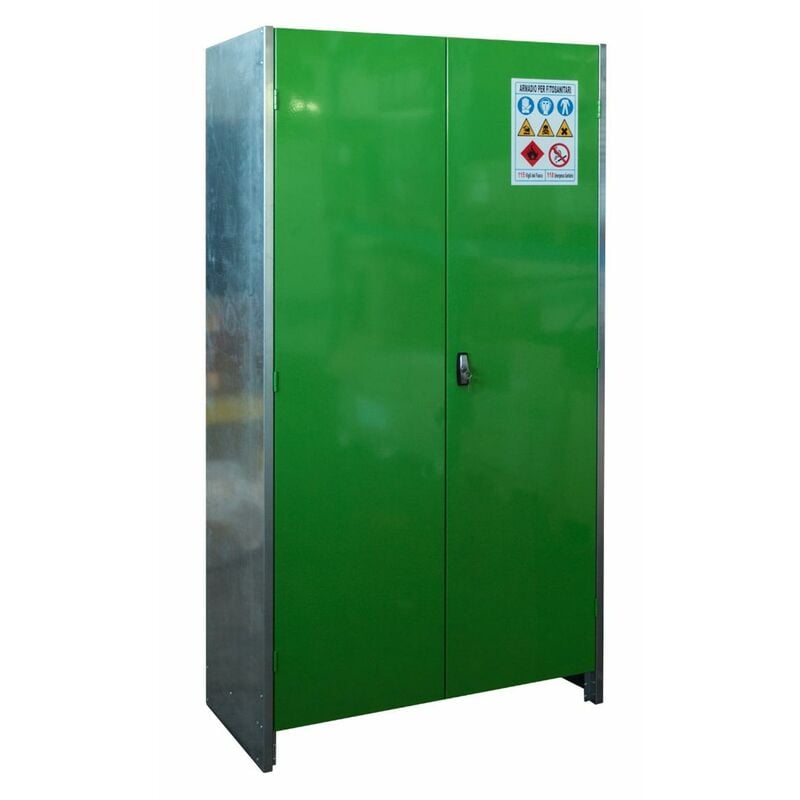 L' armadio per fitosanitari con due ante è progettato per garantire sicurezza e resistenza nello stoccaggio di prodotti chimici . Questo modello è costruito con un telaio in lamiera d'acciaio al carbonio, zincato a caldo e verniciato verde, assicurando una lunga durata e protezione contro la corrosione . Le dimensioni dell'armadio sono 2000 mm di altezza, 1000 mm di larghezza e 500 mm di profondità, offrendo ampio spazio per lo stoccaggio . È dotato di due porte battenti che permettono un facile accesso al contenuto. La struttura monoblocco su zoccolo ne garantisce la stabilità e facilita la pulizia. L'interno dell'armadio è attrezzato con 3 ripiani e un piano vasca a tenuta di 70 mm di altezza sul fondo dell'armadio;
