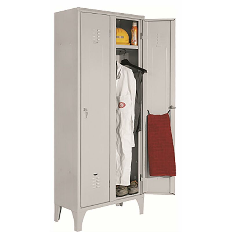 L' armadio spogliatoio su piedi è progettato per offrire una soluzione robusta e funzionale per la gestione degli indumenti in ambienti lavorativi . La struttura portante è realizzata in lamiera d'acciaio profilata di prima scelta, con uno spessore di 6/10 mm, garantendo resistenza e durabilità. Le dimensioni dell'armadio sono 70 cm di larghezza, 35 cm di profondità e 180 cm di altezza. Le ante dell'armadio sono rinforzate e dotate di feritoie di aerazione sia nella parte superiore che in quella inferiore, assicurando una ventilazione adeguata. Le cerniere interne sono speciali antiscasso, mentre il bordo frontale perimetrale arrotondato con un raggio di 6 mm offre una protezione antiurto. Le nervature longitudinali su fianchi e porte contribuiscono a rafforzare ulteriormente la struttura. Il vano interno è equipaggiato con una tramezza per separare gli indumenti sporchi da quelli puliti. È presente un ripiano superiore con un tubo ovale porta grucce in PVC, completo di due ganci
