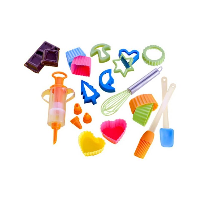 Valigetta per piccoli pasticceri con 16 pezzi in silicone e plastica. Per cucinare proprio come i grandi! Materiale: silicone e plastica