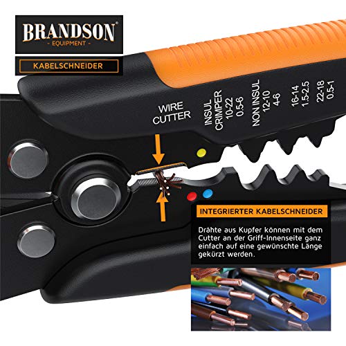 Brandson - Pinza spelacavi regolabile - 10-24 AWG - Tagliacavi per cavi con diametro di 0,2-6 mm² - Pinza crimpatrice 0,5-6 mm2 - Scatola da 60 morsetti