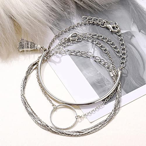 Branets Boho - Set di braccialetti in nappa con cerchio argento, di moda per feste Braccialetto per donne e ragazze, 3 pezzi