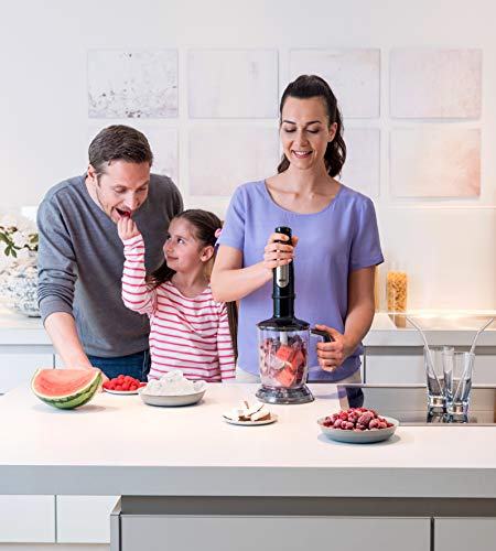 In dotazione: tritatutto da 1,25l con funzione frullatore e tritaghiaccio, frusta a filo, mini-tritatutto da 350 ml, bicchiere graduato da 600 ml in plastica senza bpa