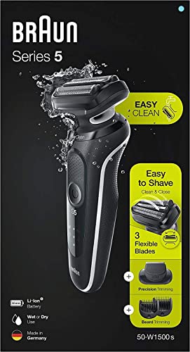 Braun Series 5, Rasoio Elettrico Barba, Accessori inclusi, Uso a Secco o Sotto Acqua, con Lame Flessibili, Base di Ricarica, Uso a Secco o Sotto Acqua, Idea Regalo, 50-W1500s Nero