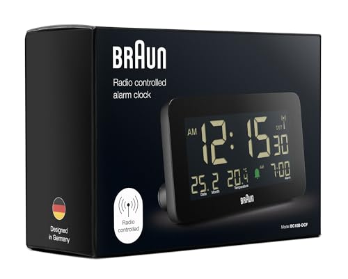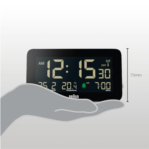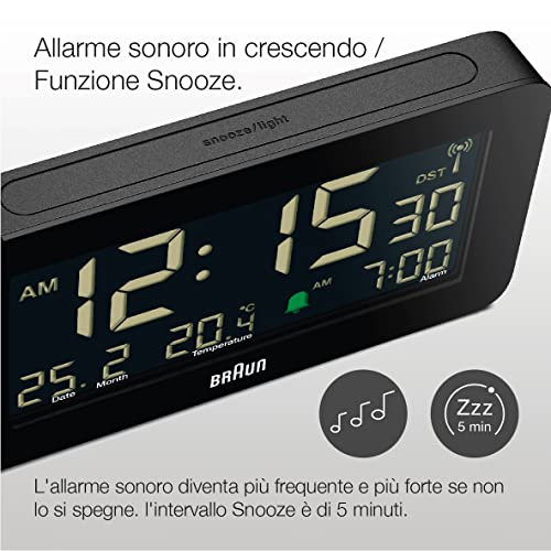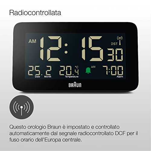 Braun Sveglia digitale visualizzazione di data, mese e temperatura, display LCD negativo, impostazione rapida, allarme acustico in crescendo, nero, modello BC10B.