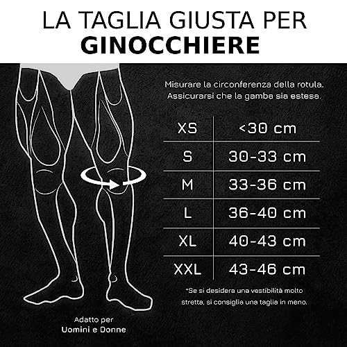 VARIE TAGLIE DISPONIBILI: Offriamo le nostre ginocchiera palestra in 6 taglie (XS, S, M, L, XL e XXL) per assicurarti di trovare una fascia ginocchio che ti dia il massimo supporto di cui hai bisogno.