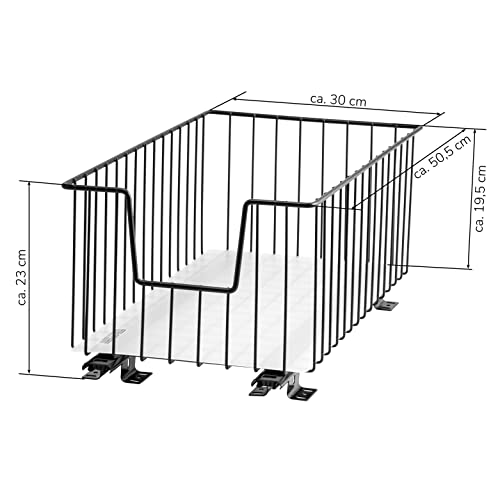 Cassetto estraibile con larghezza di 30 cm e profondità extra lunga di 50,5 cm per un migliore sfruttamento della profondità degli armadi. Adatto solo per il montaggio sul fondo degli armadi. Per rinnovare in armadietti da cucina, guardaroba, ripostiglio o in ufficio.