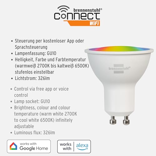 Brennenstuhl Connect - Lampadina WiFi GU10 compatibile con Amazon Alexa e Google Assistant, 326 lm, 4,5 W, bianco caldo (2700 K), luce bianca fredda (6500), dimmerabile, app gratuita