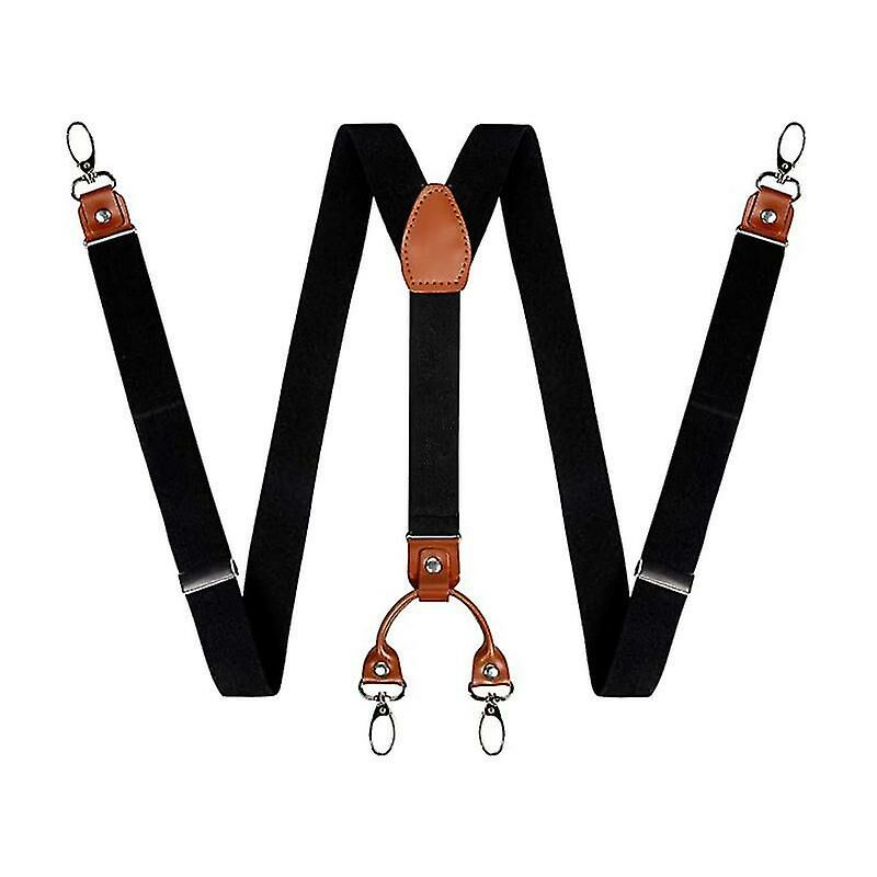 Materiale del prodotto: cintura elastica, accessori in metallo, doppia pelle Colore: nero Dimensioni: 2,5 * 110 cm Peso: circa 100 g Morsetto chiuso Cinghie elastiche e clip robuste: queste cinghie sono realizzate con il più comodo poliestere elastico regolabile e diene elastico e le cinghie super elastiche possono essere facilmente regolate tramite fibbie. La clip è realizzata in metallo solido di alta qualità con denti. Non fa male ai vestiti, è antiscivolo, non sbiadisce facilmente, fissa saldamente i pantaloni, è facile da usare ed è solido e resistente. Design classico e confortevole: la parte posteriore a forma di Y è dotata di 4 clip in metallo resistenti avanzate per aiutare a mantenere i pantaloni in posizione verticale e non scivolare. Il design classico è abbinato a morbida pelle marrone, robusta fascia elastica ad alta densità e pelle coordinata di alta qualità, che può mantenere l'aspetto dei pantaloni pulito e confortevole. Bel regalo per gli uomini Queste bretelle da