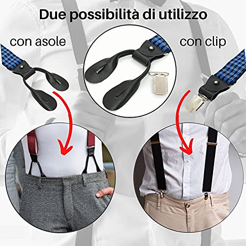 MR.M Bretelle uomo- 3 clips con asole incrocio Y- Regolabili fino a 195cm- Finiture vera pelle (Quadretto blù-nero)