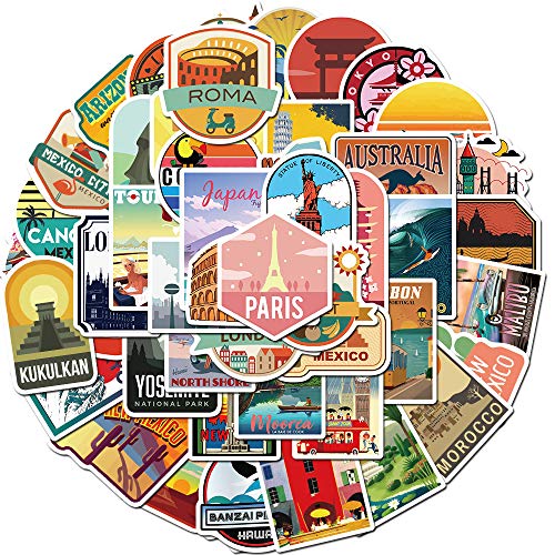 Bric Dodo 50 adesivi per mappe da viaggio, bottiglie d'acqua per computer portatile, telefono, skateboard, auto, computer, famosi nel mondo, adesivi per turisti, in vinile, bambini, adulti e bambini