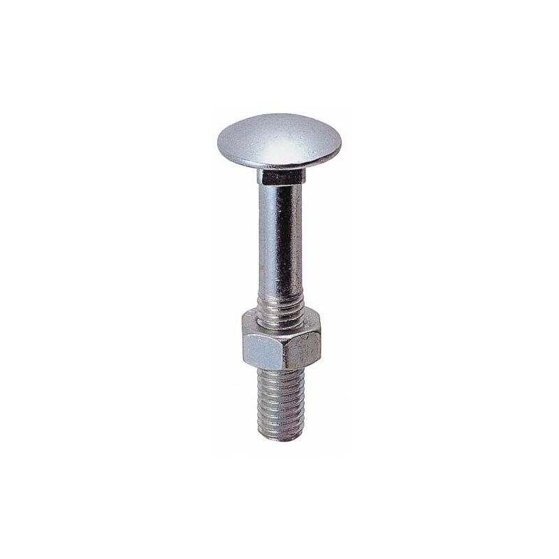 In acciaio zincato classe 4.8. Testa tonda con quadro sotto testa. Dadi esagonali DIN 603 - 555. Diametro 8 mm Lunghezza 90 mm