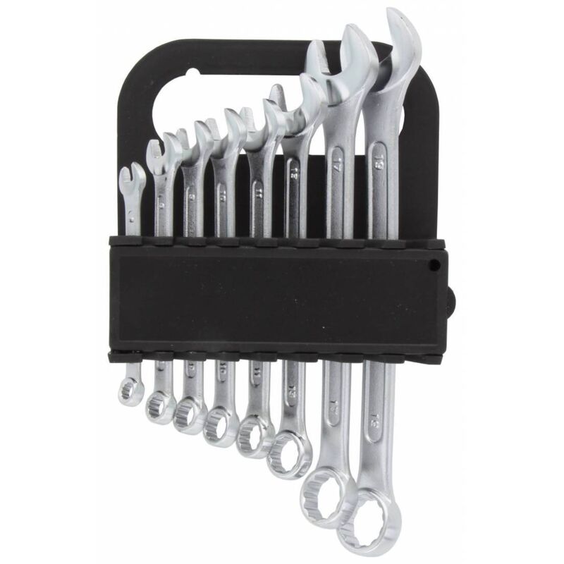 Set di 8 chiavi in acciaio al cromo vanadio con esecuzione cromata e teste lucide, doppia testa i lato fisso e l'altro a occhio. il set è composto da: 8 chiavi doppia testa misura da 6-19 mm Il kit è ideale per professionisti o per piccoli lavori di bricolage.