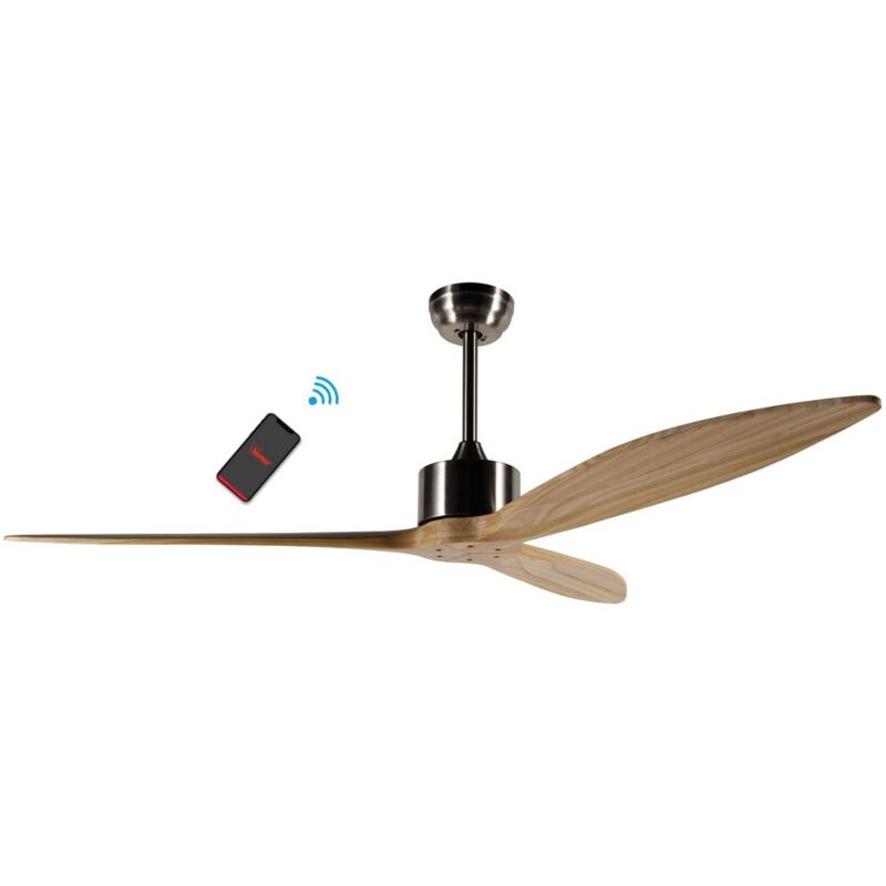 Ventilatore da soffitto con dimensione Ø 152 cm con 3 pale in legno senza luce, design industirial ideale per casa o negozio.Il ventilatore con Wifi 2.4GHz è possibile controllarlo con il telecomando e con APP, possibile anche con comandi vocali tramite Alexa e google assistent.Motore con 6 regolazioni di velocità e tre tipi di modalità Normal/Natural/Sleep, tramite l'app è possibile gestire il timer spegnimento da 1-8 si programmano anche i periodi giornalieri di funzionamento. Ventilatore con doppia rotazione estate e inverno: In estate: Possono essere utilizzati combinati all'aria condizionata d'estate impostando la rotazione delle pale dal basso verso l'alto per distribuire l'aria condizionata in modo più uniforme e salutare;
