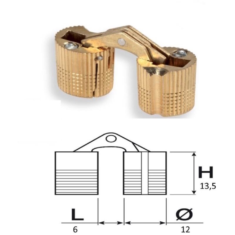 Utilizzabile sia per ante in battuta sia in luce. Indicata anche per tavoli con allunghe pieghevoli. CERNIERA OTTONE INVISIBILE DIAM. MM.10 H: 13,5 L: 6 Ø: 12