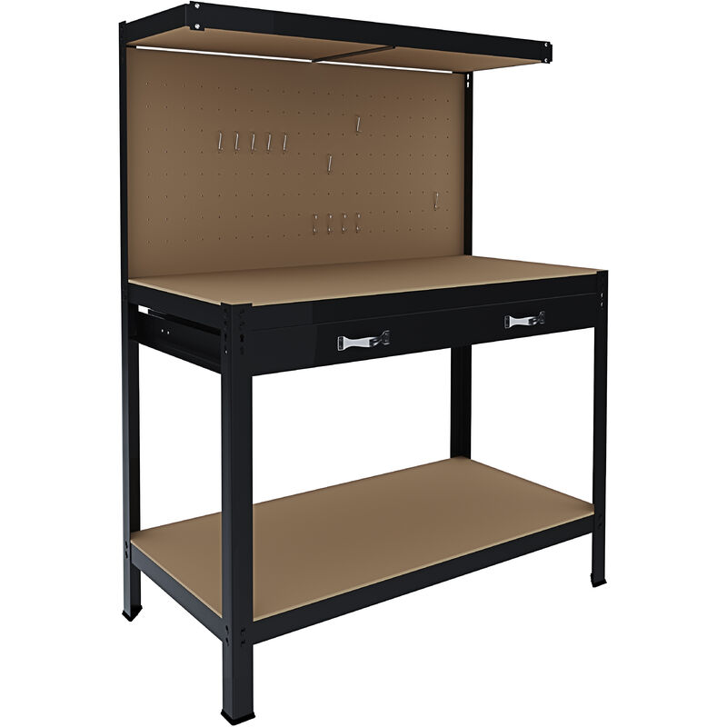 Banco da lavoro Warri in acciaio con 3 ripiani in MDF, cassetto e pannello porta attrezzi. Ideale per garage, officine, cantine o magazzini. Grazie alla sua alta portata di 370 kg è in grado di immagazzinare qualsiasi tipo di oggetto. Di facile montaggio grazie alla struttura senza bulloni (Push-fit) che può essere montata senza l'utilizzo di attrezzi. Potrai riporre fino a 30 kg sulla mensola superiore, fino a 100 kg sulla mensola inferiore mentre il piano di lavoro ha una portata massima di 200 kg. Il cassetto sotto il banco da lavoro è invece in grado di sopportare ben 40 kg! Il comodo pannello frontale è forato e ti permetterà di appendere tutti i tuoi attrezzi tramite dei ganci (NON inclusi). Caratteristiche principali: - Dimensioni totali: 155 x 120 x 60 cm (Altezza x larghezza x profondità) - Portata massima: 370 kg - Portata ripiano superiore: 30 kg - Portata banco di lavoro: 200 kg - Portata ripiano inferiore: 100 kg - Portata cassetto: 40 kg - Con pannello forato per