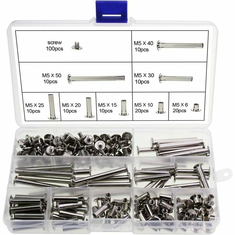 può essere utilizzato ripetutamente. 3. Viti di rilegatura assortite: 8 misure, 100 set di viti di rilegatura in totale. 4.Ideale per decorazioni artigianali in pelle, rilegature, documenti, libri, album fotografici di diari, prenotazione di rottami, artigianato fai-da-te, ecc. 5. Organizzato per dimensione in una custodia trasparente per un rapido accesso e protezione. Benvenuto per incontrarti