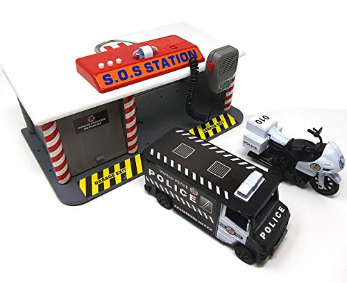 Brigamo Stazione di polizia giocattolo con Martinshorn, sirena e Miko, auto della polizia e moto della polizia