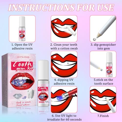 ✨Facile da usare: Basta seguire le istruzioni incluse nel kit brillantini per denti e vedrai quanto sia facile applicare i brillantini sul tuo dente. La procedura è semplice e veloce, Che tu sia un principiante o un utente esperto, il nostro tooth gems kit è facile da usare.