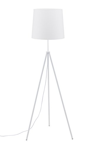 Lampada da terra, senza tempo, tre piedi, bianca, con elegante paralume in tessuto.